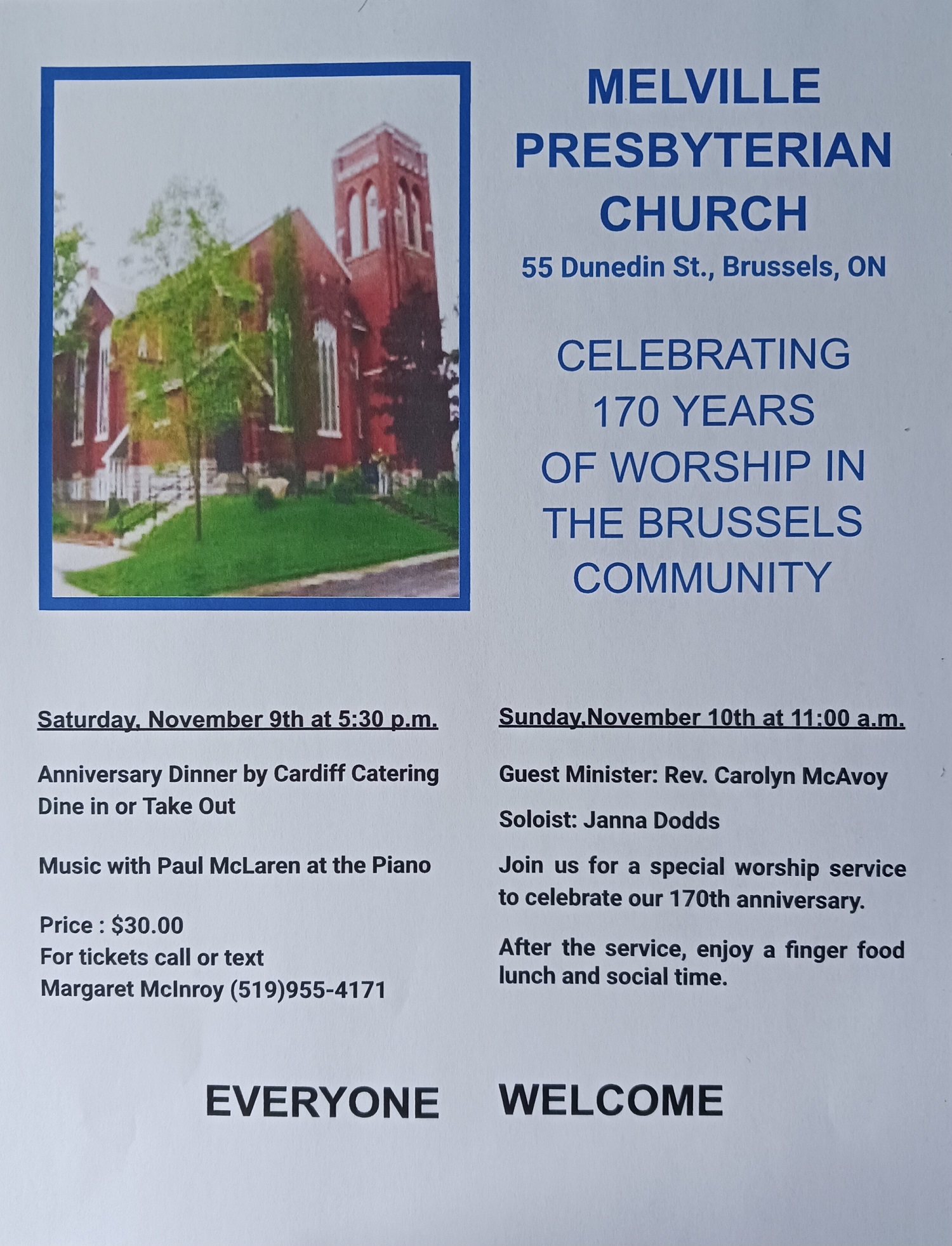 Melville Presbyterian Church is celebrating 170 years of worhsip in Brussels. Enjoy a dinner by Cardiff Catering on Saturday, November 9th beginning at 5:30p.m. Dine in or take out. Music with Paul McLaren at the piano. Tickets are $30. Call or text 519-955-4171 for tickets.