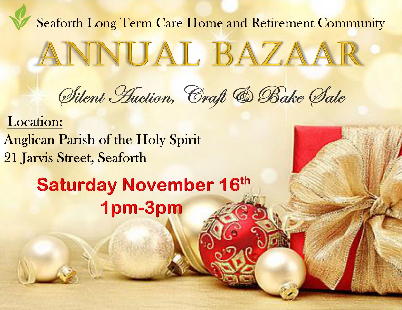 Stop by the Seaforth Long Term Care Home and Retirement Community Annual Bazaar on November 16th at the Anglican Parish of the Holy Spirit in Seaforth. Silent Auction and Craft and Bake Sale will run between 1:00p.m. and 3:00p.m.