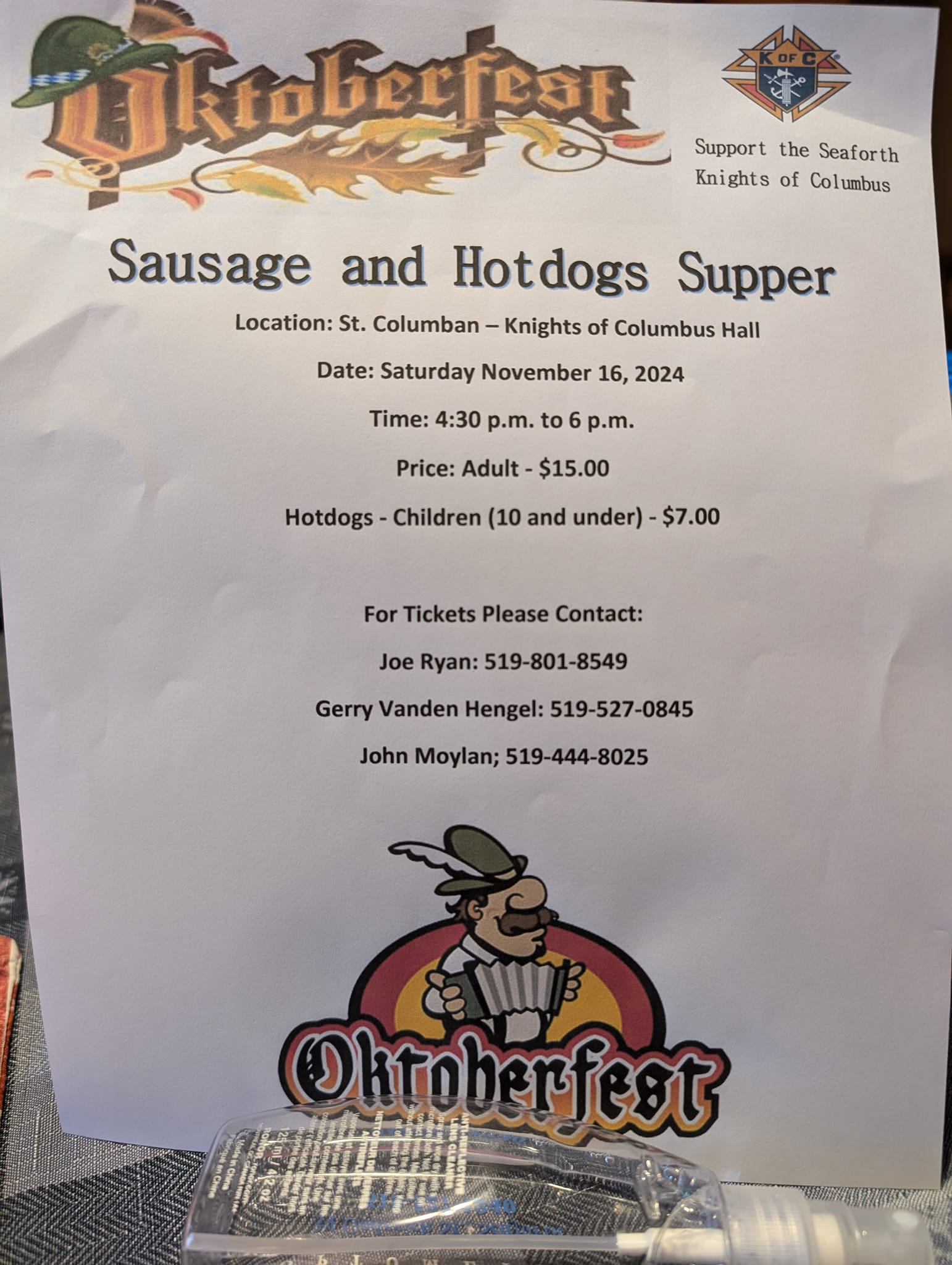 Support the Seaforth Knights of Columbus by purchase a ticket to their Sausage and Hot Dog Supper! Adults are $15.00. Tickets for hot dogs for children aged 10 and under are $7.00. For tickets, please contact: Joe Ryan (519-801-8549), Gerry Vanden Hengal (519-527-0845) or John Moylan (519-444-8025).