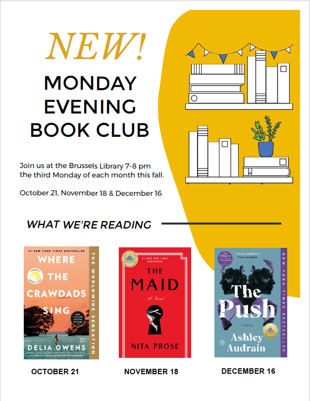 Meets the 3rd Monday of each month this fall -October 21, November 18 & December 16 from 7:00 - 8:00pm. Read the book of the month and join the group discussion. Contact the Brussels Library for a copy of the title of the month. Everyone is welcome to this free event.