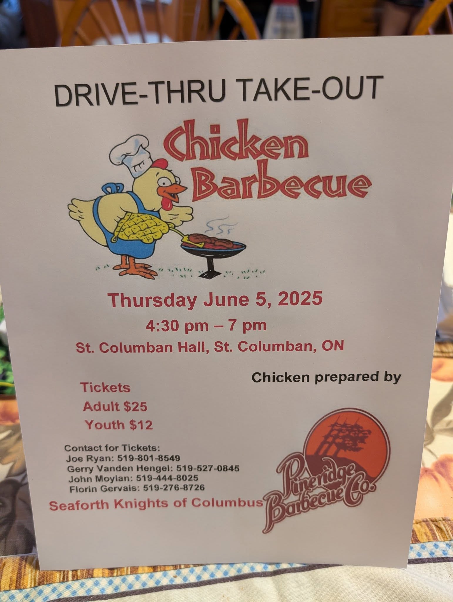 Don't miss out on this fabulous Take-Out Chicken Dinner! Chicken prepared by Pineridge Barbeque. Advanced tickets only.