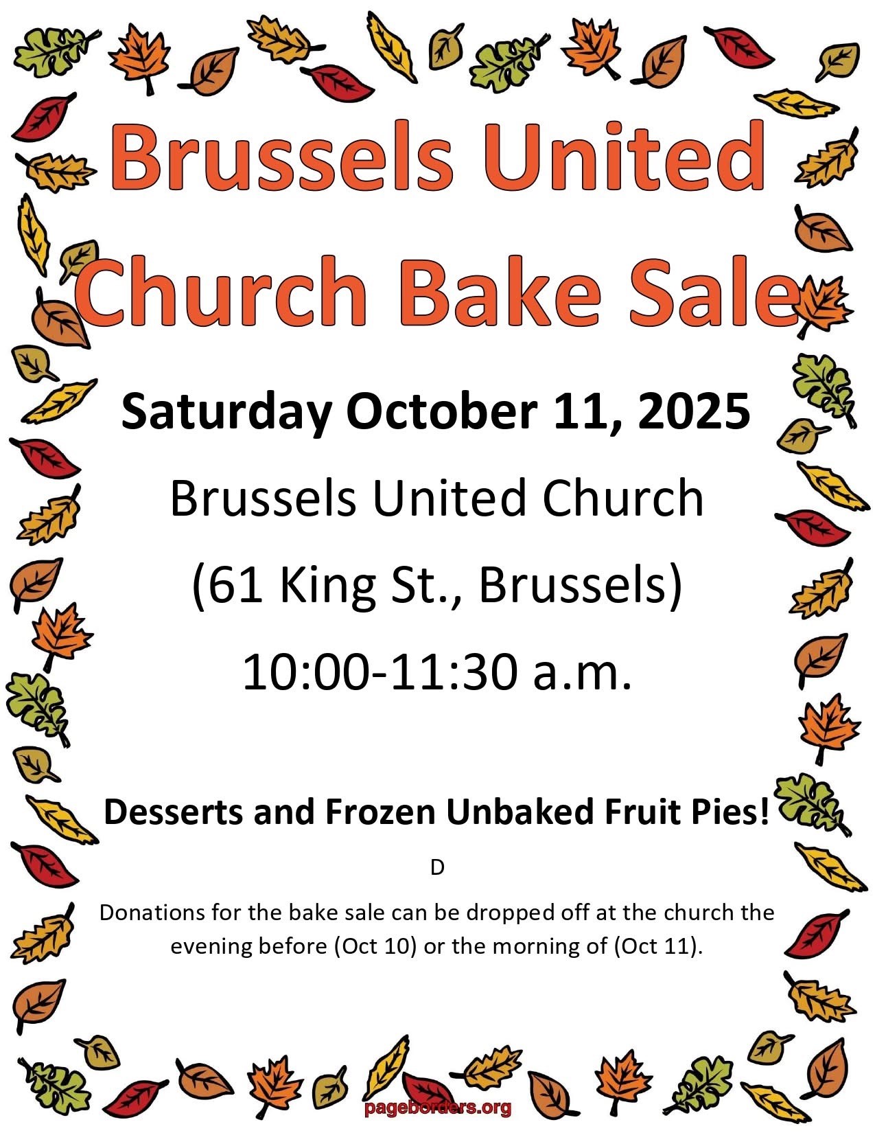 The Brussels United Church is having a bake sale on October 11th between 10:00a.m. and 11:30a.m. Desserts and frozen unbaked pies available!