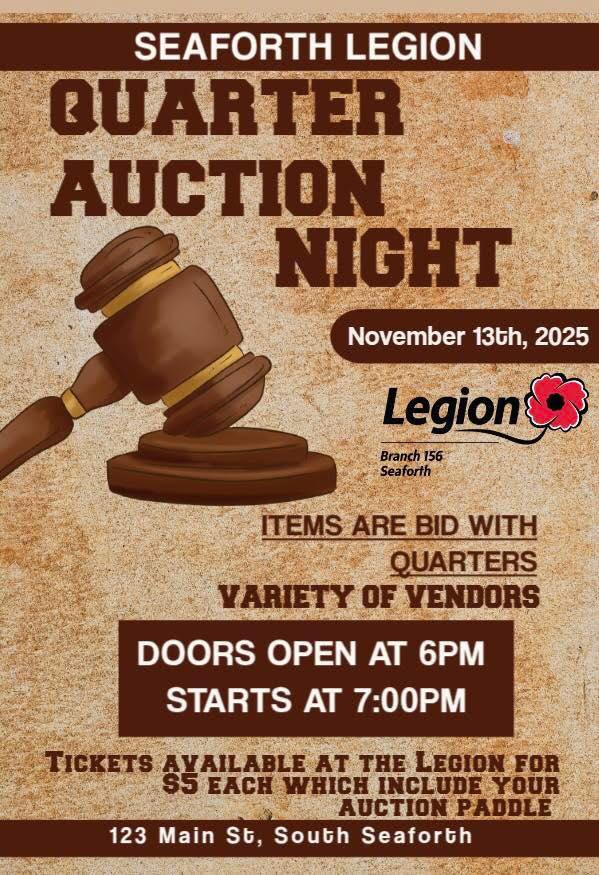 The Seaforth Legion is hosting a Quarter Auction Night on November 13, 2025. Items are bid with quarters. Variety of vendors. Doors Open at 6:00p.m. Starts at 7:00p.m. Tickets available at the Legion for $5 which includes your auction paddle.